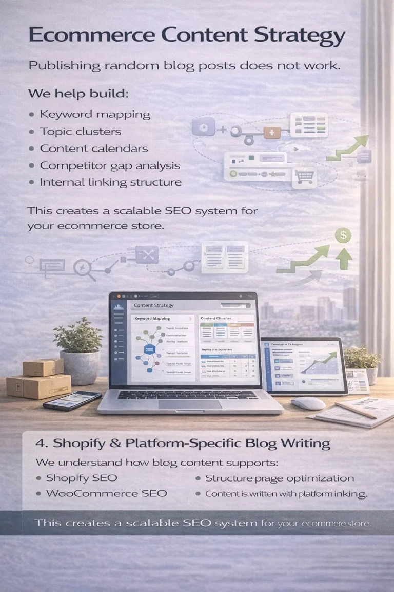 Our ecommerce blog writing services are designed to help online stores rank for high-intent keywords, attract potential buyers, and turn content into revenue.