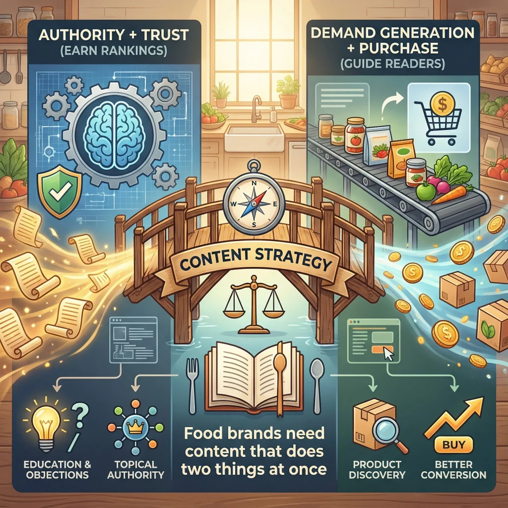 Food brands need content that does two things at once. First, it has to earn rankings and trust. Second, it should guide readers toward a purchase.