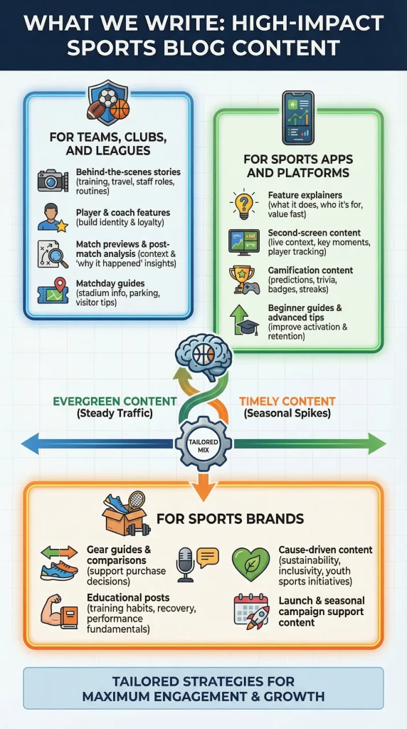 A high-performing Sports Blog blends evergreen content (steady traffic) with timely content (seasonal spikes). We tailor the mix to your sport, audience, and business model.